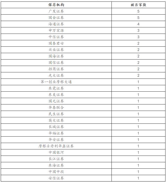 被否企业的按照保荐机构分布:广发证券和国金证券都否5家。