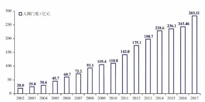 ▲中国企业500强历年入围门槛(2002—2017)