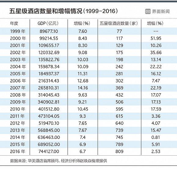 与此同时,从1999年到2016年,全国五星级酒店数量增长了10倍,达到809家,其中增长最为迅速的时期在2010年之前。每隔两三年,都出现一个五星级酒店数量增长的高潮。行业研究认为,国内生产总值上升1%,酒店业市场可以上升0.914%。而数据统计显示,从1999年起,除2006年、2011年、2012年、2014年至2016年,其余年份国内五星级酒店的增长速度都超过国内GDP增速。