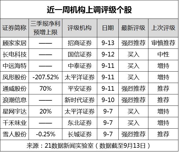 最近一周,机构上调了顾家家居、长电科技等9只个股的评级,不过无一给出明确的目标价。