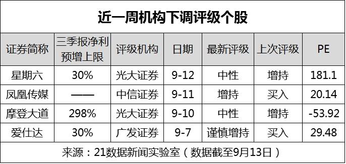 4只被下调评级的个股,分别是星期六、凤凰传媒、摩登大道、爱仕达。