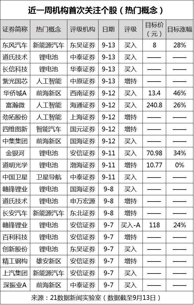 其中,115家公司获得一些券商分析师首次评级关注,多数涉及新能源汽车、锂电池、人工智能等热门概念,包括近年的十倍大牛股赣锋锂业,以及13日涨停的道氏技术在内。