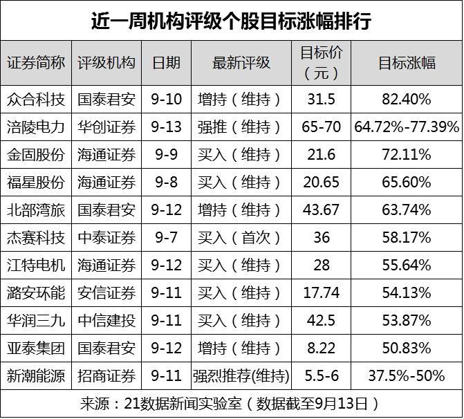 其中,目标涨幅最大的为众合科技,国泰君安维持6个月目标价31.5元,按13日收盘价17.27元计算,该股或有82.4%的上涨潜力。