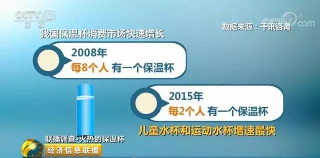 另外,我国保温杯消费市场在快速地增长,2008年,每8个人才有一个保温杯,而到了2015年,每两个人就有一个保温杯。其中,儿童水杯和运动水杯的增速最快。