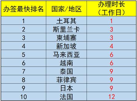 根据最大规模的在线签证办理数量和专业的办签经验,携程旅游发布了我国游客“办签最快目的地国家排行榜”TOP10,依次是土耳其、斯里兰卡、柬埔寨、新加坡、马来西亚、越南、泰国、菲律宾、日本、法国。