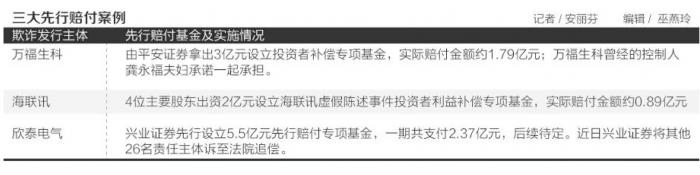 比如万福生科(300268.SZ,现为佳沃股份)欺诈发行案中,由平安证券拿出3亿元设立投资者补偿专项基金,实际赔付金额约1.79亿元;海联讯(300277.SZ)欺诈发行案中,上市公司的4位主要股东出资2亿元设立海联讯虚假陈述事件投资者利益补偿专项基金,实际赔付金额约0.89亿元。