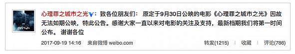 然而已经宣传预热了几轮的《心理罪之城市之光》,19日上午官方微博宣布因未获得公映许可证,所以无法按原计划于9月30日上映,但随后又秒删微博。19日下午,该片官微重新发布公告,称电影因故无法如期公映,但并未透露具体原因。从预告中能看到《心理罪之城市之光》血腥暴力场面不少,但临近上映不到两周却还未能过审拿到公映许可证似乎颇不合理。