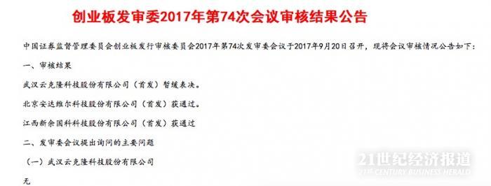 9月20日晚间,证监会官网公布的创业板发审委2017年第74次会议审核结果显示,武汉云克隆科技股份有限公司(以下简称 “云克隆”)首发被暂缓表决。证监会官网并未公布云克隆被暂缓表决的原因,同时在发审委会议上也并未对云克隆提出问询。