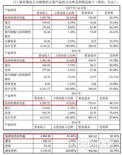 在公司最新的招股书中第73页披露了主营业务收入构成,其中披露2014-2016年、2017年1-6月免疫检测试剂盒收入占营收的比重为 96.78% 、96.66% 、87.95% 、83.05%;蛋白收入占营收的比重为1.95%、1.74%、5.46%、6.39%;抗体收入占营收的比重为 1.27%、1.60%、5.95%、8.82%;2016年、2017年1-6月原代细胞与疾病模型服务收入占营收的比重为0.13%、1.16%;2016年、2017年1-6月仪器设备收入占营收的比重为0.01%、0.59%。