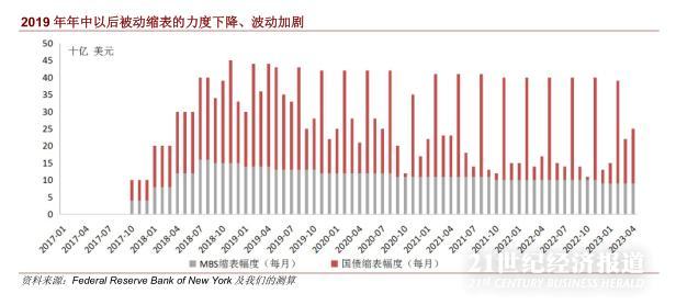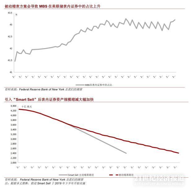 值得注意的是,美联储的主动缩表将是一种相机抉择的“Smart Sell”。在此前的扩张过程中,美联储表内资产的久期大幅延长,对长端利率形成了显著的抑制。因此,缩表不仅在于“缩规模”,还在于“缩久期”,以抬升长端利率、修复收益率曲线。但是,在美联储的既定方案下,被动等待债券偿付的缩表方法对此作用甚微。例如,在缩表前的2017年9月,以长期为主的MBS在证券组合中的占比为41.9%,而在缩表后的2023年4月,这一比重不降反升,预计将达到43.2%(详见附图)。因此,缩表配额和实际到期偿付量的差额,可以视为美联储提前预留、以供相机抉择的政策工具。通过利用这部分闲置的额度,美联储可以根据收益率曲线的扭曲情况,适度地主动卖出长债和MBS,甚至买短卖长。这不仅将平滑地加快缩表进程,更能够针对性地加速缩短证券组合久期,推动收益率曲线的正常化。在“Smart Sell”开启前,缩表操作只有位移作用,整体推高收益率曲线的位置。而在“Smart Sell”开启后,缩表操作将兼具形变作用,有力地相对抬升长端利率,从而修复金融市场的定价效率。此外,“Smart Sell”的这一重要作用,难以用其他政策工具进行替代,因此也大幅提高了其在2019年下半年被启动的可能性。
