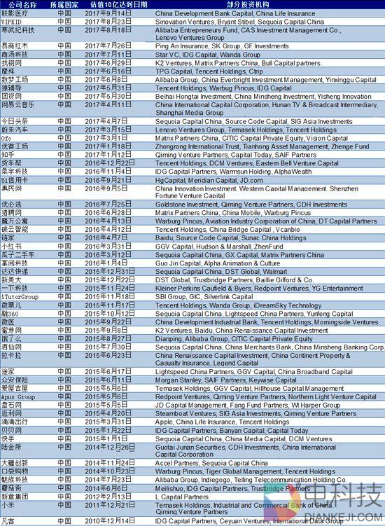 中国共有55家企业上榜,滴滴、新美大集团、小米和陆金所挤入非美地区最受瞩目的独角兽公司前10名。其中,滴滴出行的估值达到500亿美元,小米的估值也达到460亿美元。