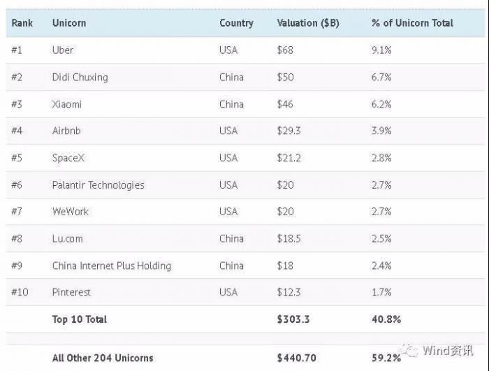 △全球排前十的独角兽公司总市值达到3033亿美元