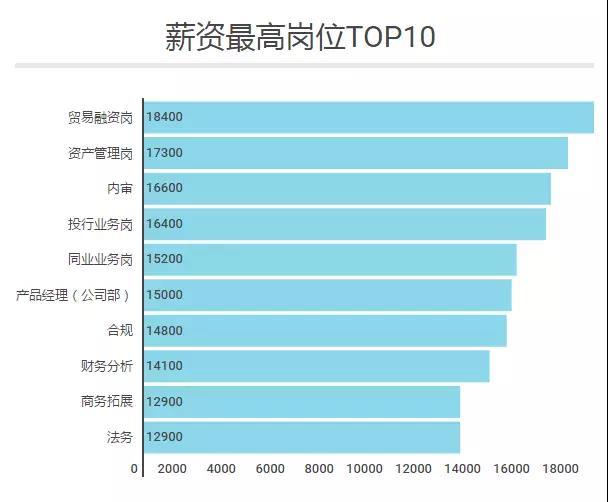 在薪资TOP10榜单中,贸易融资类、资产托管类、投行业务类、同业业务类岗位占据了前5的4席,平均工资从15K起,一路涨到18K以上。前5中唯一不涉及直接创造利润的是内审岗位。而从第6开始,岗位类型偏多元化,合规、财务分析、商务拓展、企划等各类型岗位纷纷榜上有名,且第10名的法务也突破了10K大关,可见银行各类业务板块的薪资水平都不低,竞争力十足。