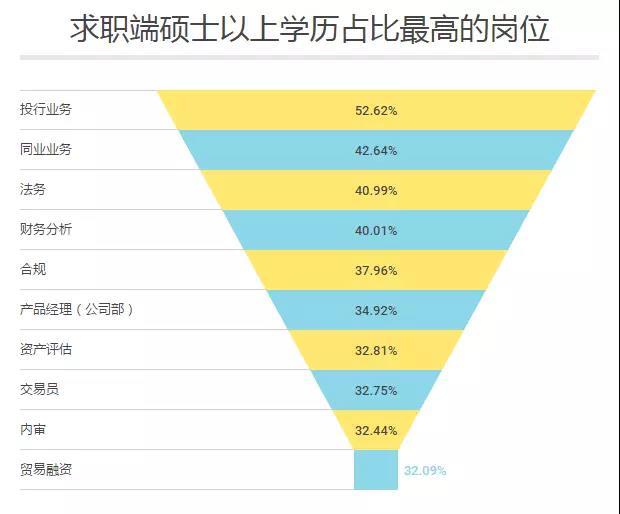 高薪岗位与高学历岗位的名单出奇一致,投行业务岗的学霸占比尤其亮眼,不仅一半以上(54.28%)出身自985、211名校,更有一半以上(52.62%)手拿硕士学位。法务、同业业务、合规的学霸比例同样巨大,无论硕士占比还是名校出身的占比,都超过35%。另外,名校排行及硕士以上学历排行,这两张表单挤进前10的岗位,占比无一例外都超过30%,即,要竞争这些岗位,至少要和1/3以上的高素质人才正面PK。银行界果然藏龙卧虎,想拿下高薪岗位的offer,没有几张亮眼的证照和名校背书不行。