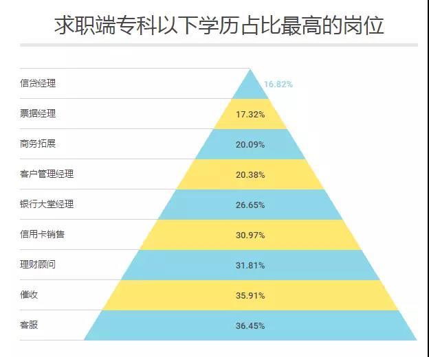专科以下岗位则更多集中于销售类以及基层类岗位,客服、催收、客户管理经理、理财顾问、信贷经理,实际上都是与客户维系、销售息息相关的工作。这些岗位要在晋升方面也通常需要花更长的时间(见下图)。在跳槽市场上,这些岗位的人脉资源、业务熟悉程度以及突发状况的应变更有优势。