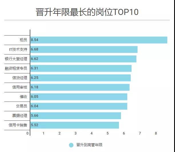 而银行大堂经理方面,尽管背着经理头衔,但从数据来看,目前诸多单位的银行大堂经理工作经验并不丰富,超过1/3以上工作经验在3年以下,晋升难度也位列前3甲。状况及境遇类似的还有柜员,两者的晋升难度都颇高,要一路晋升到高管,至少需要6-8年时间。实际上不仅大堂经理、柜员的晋升难度高,非核心业务岗位如IT技术支持、信用审核、催收等岗位的晋升难度及耗时同样高得可怕。