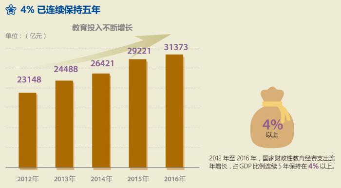 2012年国家财政性教育经费首次突破2万亿元,占GDP比例首次超过4%。这是我国教育发展史上的一个重要里程碑。2012年至2016年,国家财政教育经费支出连年增长,占GDP比例连续5年保持在4%以上。