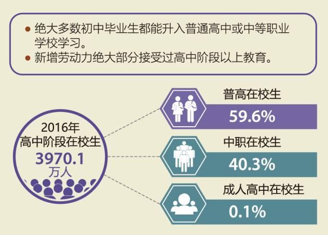 2016年,全国共有高中阶段学校2.5万所,受学龄人口下降影响,在校生3970.1万人,比2012年减少625.2万人。其中,普通高中1.3万所,在校生2366.7万人;中等职业学校1.1万所,在校生1599万人,中职学生占40.3%。2016年,我国高中阶段毛入学率达到87.5%,比2012年提高2.5个百分点,高于中高收入国家83.8%的平均水平。