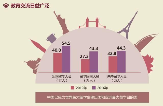 目前,我国已与世界上188个国家和地区建立了教育合作与交流关系。2016年度我国出国留学人员总数为54.5万人,我国已成为世界上最大的留学生生源国;来自205个国家和地区的44.3万人次留学人员在华学习,我国已成为亚洲最大的留学目的国。