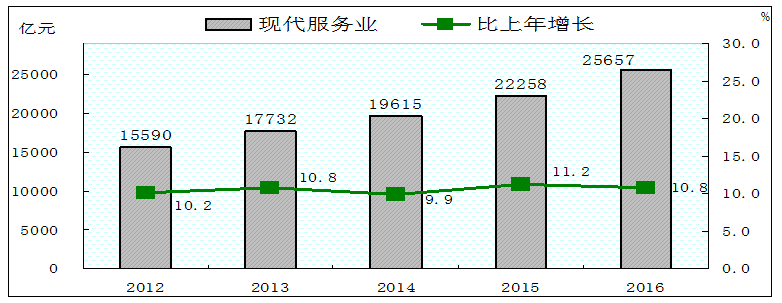 现代服务业增加值总量不断提高,从2012年15589.90亿元提高到2016年的25656.81亿元,增加了1万亿元,平均每年增加2.5千亿元,按可比价格计算2013-2016年均增长达10.7%,高出第三产业增幅1.6个百分点,也高出GDP增幅2.8个百分点。