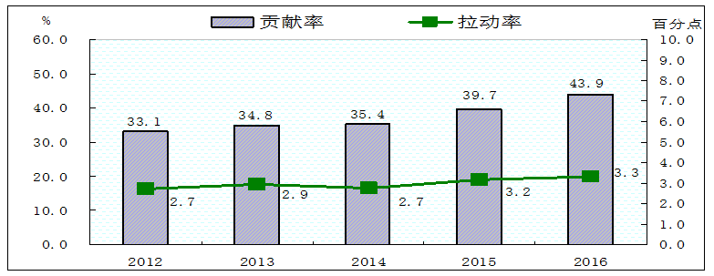 表2、2012-2016年广东现代服务业对经济增长贡献率及拉动率