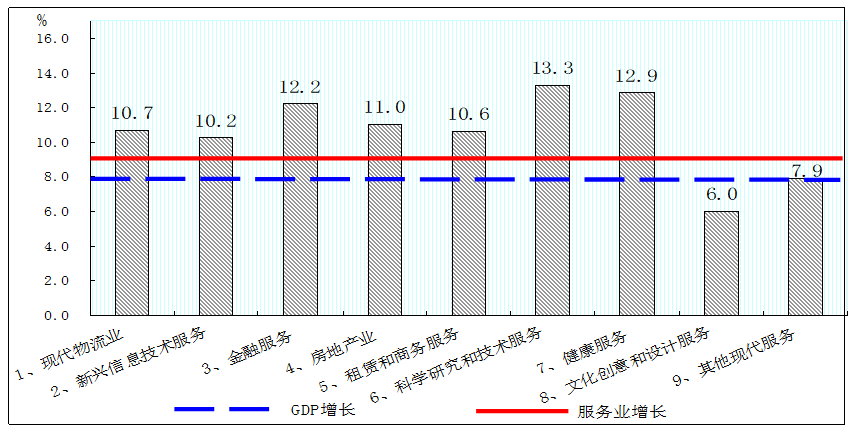 现代物流、新兴信息技术服务、金融服务、租赁和商务服务、科学研究和技术服务、健康服务等现代服务业加快发展。2016年现代服务业对经济增长的贡献率为43.9%,首次超过工业成为经济增长的首动力,拉动GDP增长3.3个百分点。2013-2016现代服务业对经济增长的平均贡献率为38.5%,对广东经济发展起“加速器”和“稳定器”作用。