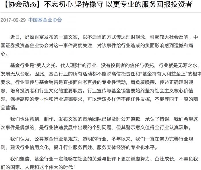 9月29日晚间,中国基金业协会官方微信推送了一则标题为《不忘初心 坚持操守 以更专业的服务回报投资者》的协会动态,对近两日引起极大争议的蚂蚁财富“负能量文案”事件进行了点评。