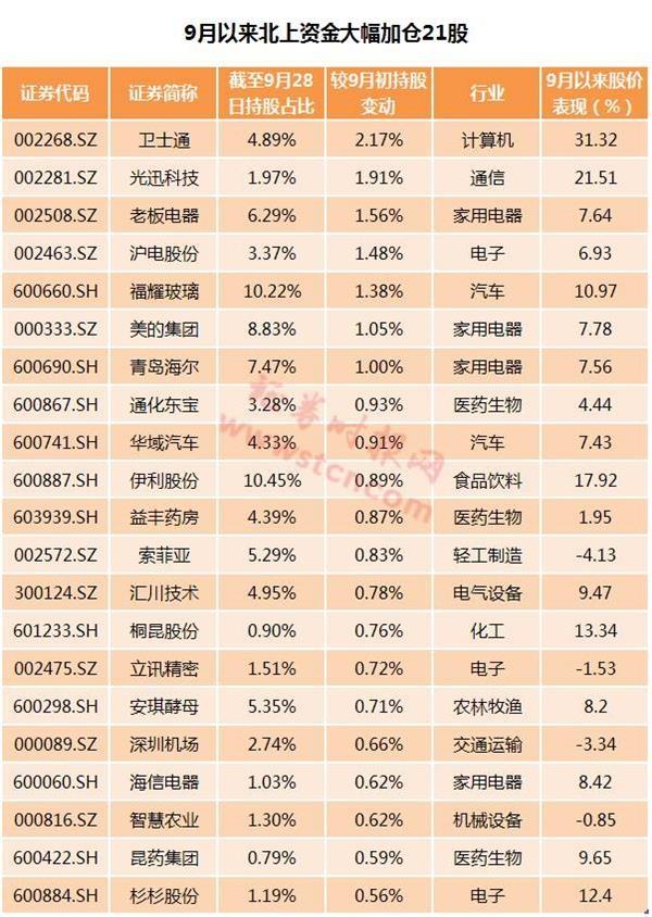港交所沪港通及深港通持股纪录显示,9月以来(截至28日),北上资金累计对21股持股比例变动超过0.5%,其中卫士通、光迅科技、老板电器、沪电股份、福耀玻璃、美的集团等6股持股比例增超1%。