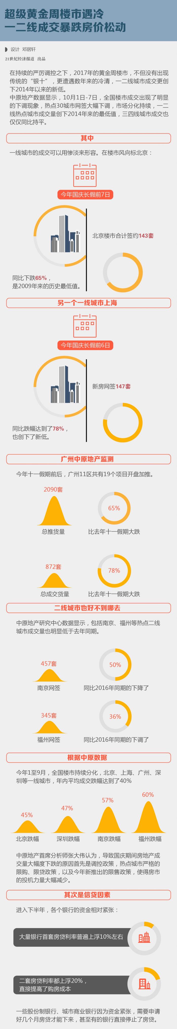 在持续的严厉调控之下,2017年的黄金周楼市,不但没有出现传统的“银十”,更遭遇数年来的冷清,一二线城市成交更创下2014年以来的新低。