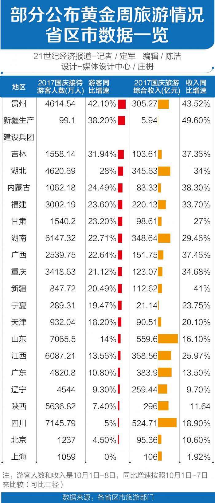 今年“十一”,游客增速最快的十个地区包括贵州、新疆生产建设兵团、吉林、湖北、内蒙古、福建、甘肃、湖南、广西、重庆。
