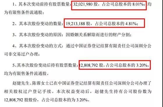 但是如果往深了研究,此次离婚,将股权进行分割后,两人所持股份都处于5%红线以下, 联想到5月份证监会发布的上市公司董监高减持新规,这桩离婚案颇值得玩味。