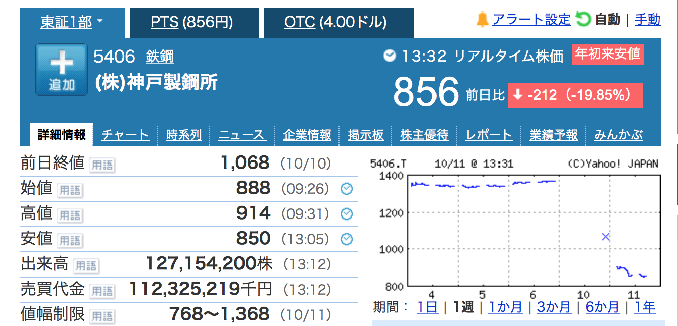 继10月10日股价大跌20%后,日本神户制钢所(简称“神钢”)10月11日股价继续大幅下挫,截至发稿时跌幅近20%,两日跌幅近40%。神钢10月8日发布消息称,曾篡改部分铝制品的强度等性能数据并进行了供货,确认违规的制品为2016年9月至2017年8月期间的部分铝及铜产品。但神钢没有透露把这些产品供应给哪些客户了,并声称未发现篡改数据事件造成安全问题。