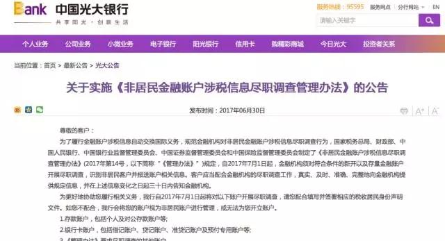 另外,包括工农中建、中信在内的十余家银行,已对公众刊出公告,要求存量非居民客户(即于今年7月1日前在银行开立过存款账户、银行卡、国债等的客户),从柜面或手机银行等签署税收居民身份声明文件。