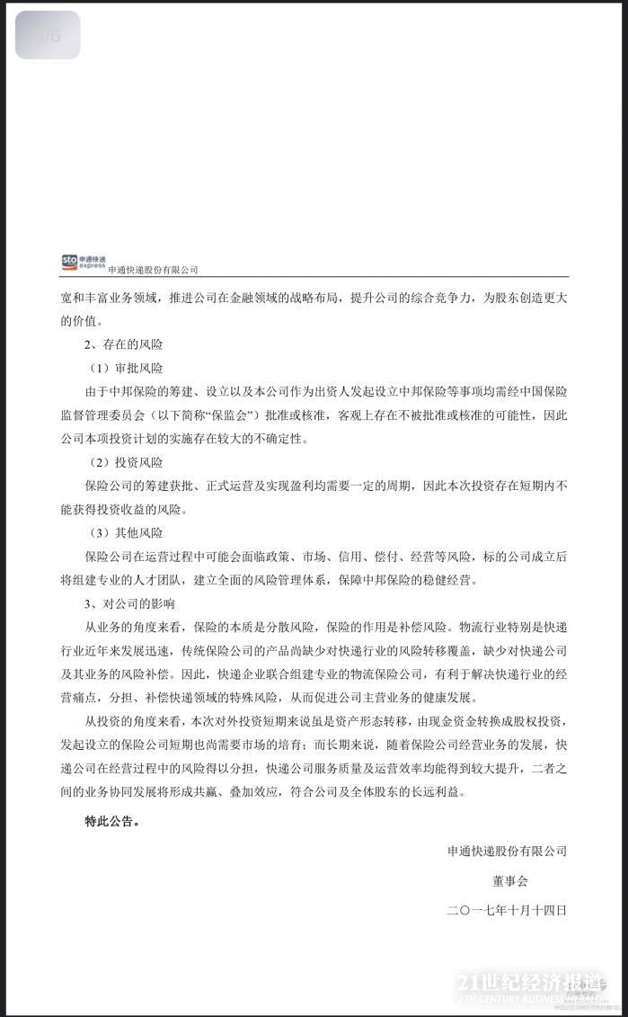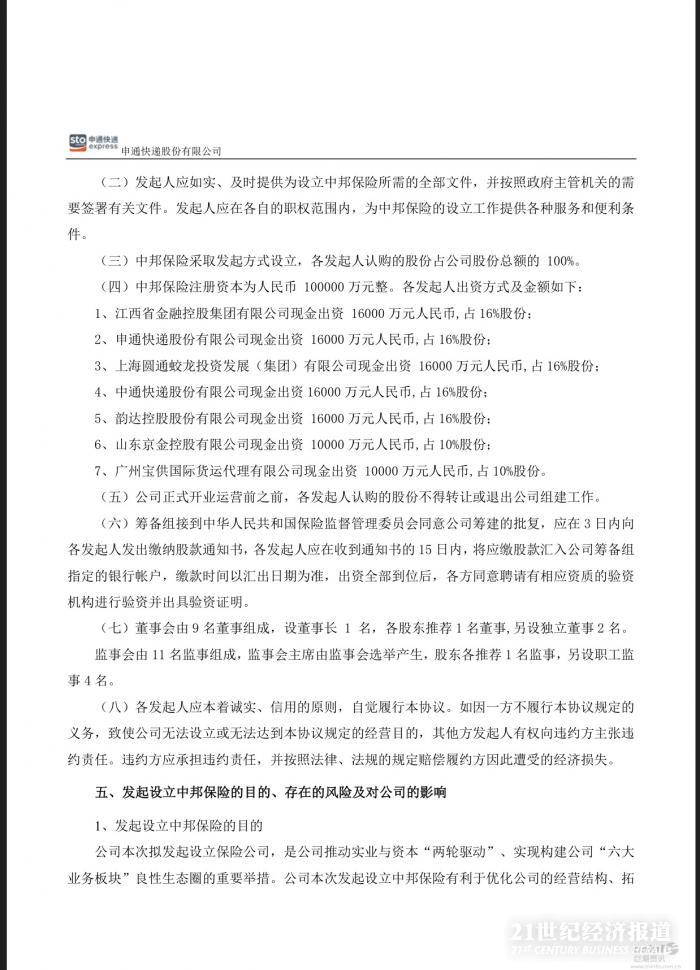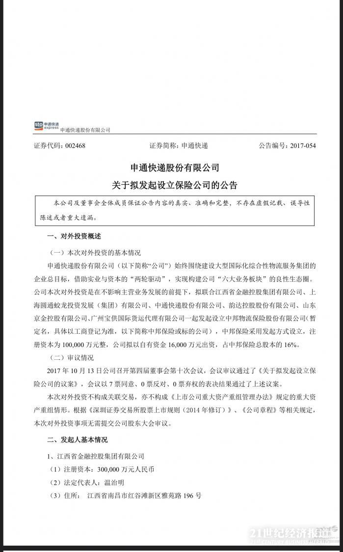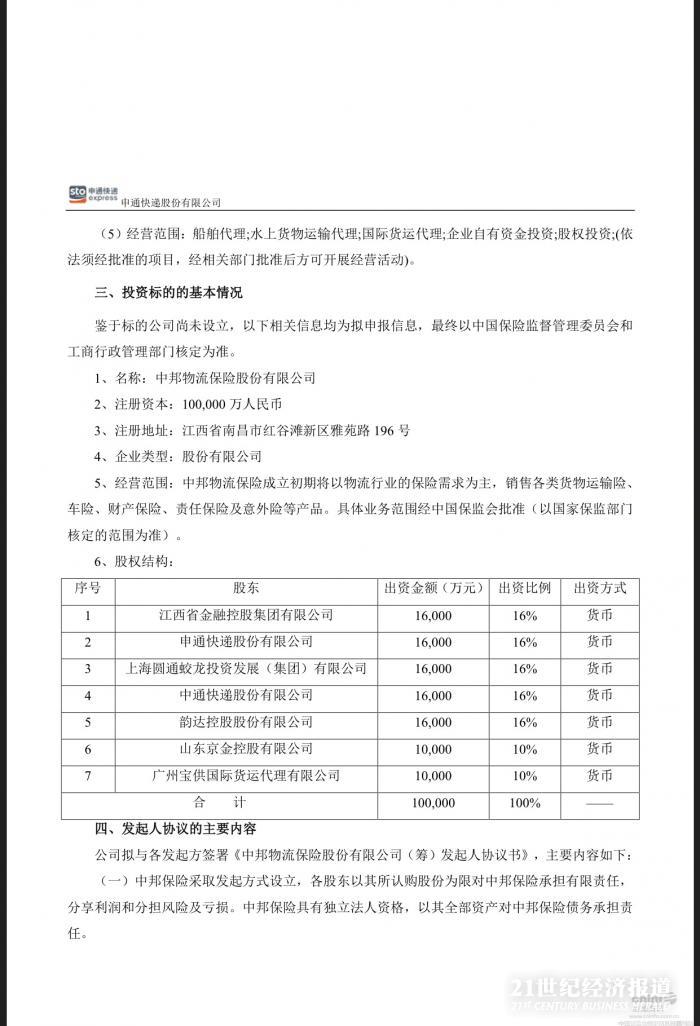 10月13日消息,申通快递拟联合江西省金融控股集团有限公司、上海圆通蛟龙投资发展(集团)有限公司、中通快递股份有限公司、韵达控股股份有限公司、山东京金控股有限公司、广州宝供国际货运代理有限公司一起发起设立中邦物流保险股份有限公司(暂定名,具体以工商登记为准,以下简称中邦保险或标的公司)。