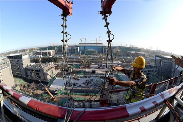 工人在北京建工集团城市副中心A2工程工地施工(2017年9月11日摄)。新华社记者 罗晓光 摄