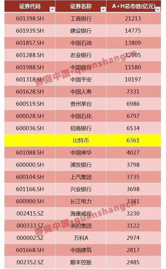 不仅是涨幅惊人,从比特币6361亿人民币(967亿美元)市值来看,也不输给A股上市公司,在A+H市值排名TOP20来看,比特币大致可以排到第11位。