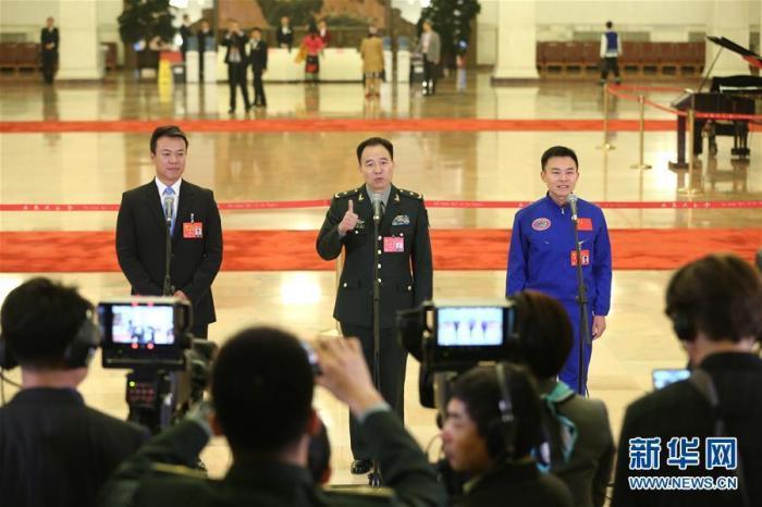 10月18日,中国共产党第十九次全国代表大会在北京人民大会堂开幕。这是开幕会前,赵宏博、景海鹏、唐嘉陵代表(自左至右)接受采访。新华社记者 殷刚 摄