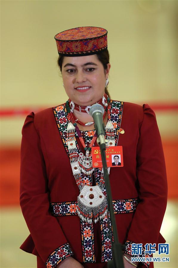 10月18日,中国共产党第十九次全国代表大会在北京人民大会堂开幕。这是开幕会前,米日姑丽·艾克米汗代表接受采访。 新华社记者 殷刚 摄
