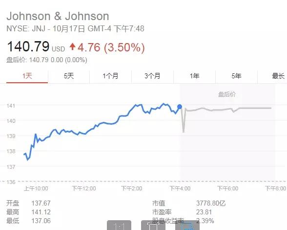 受到天价赔偿可能被取消的利好影响,强生公司股价于17日收涨3.5%,报140.79美元。