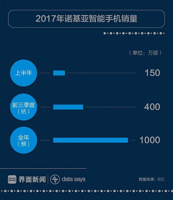 IDC数据显示,今年上半年,诺基亚智能机的全球销量为150万部。在芬兰本土,诺基亚品牌已经重回前五,并占有0.4%的市场份额。有分析师称,今年前三个季度诺基亚已经销售了约400万部智能手机,考虑到第四季度的圣诞销售季等因素,预计2017年诺基亚智能手机销量将达到1000万部。