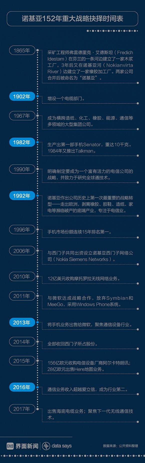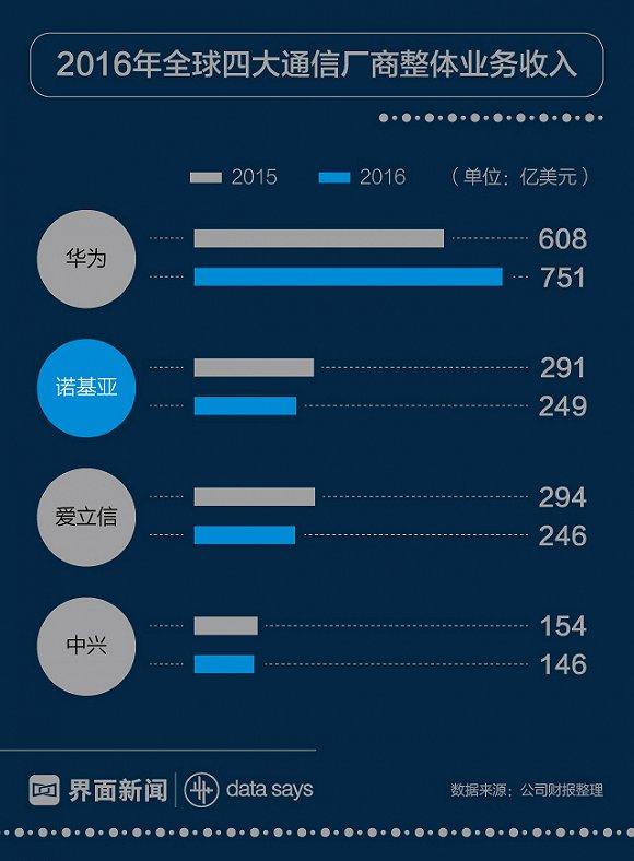 2013年,在智能机市场“无力回天”的诺基亚最终决定以54.4亿欧元的价格将手机业务出售给微软。剥离手机业务后,诺基亚开始专注于通信业务。2016年,在全球通信设备及解决方案提供商中,诺基亚以249亿美元的收入超越爱立信,排名第二,仅次于华为。
