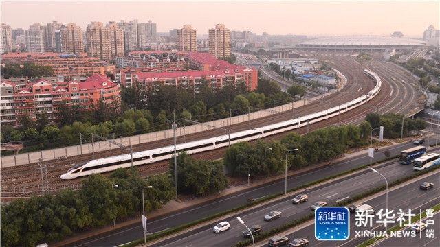 ↑9月21日,一列“复兴号”列车驶出北京南站。“复兴号”350公里时速的正式运营,标志着我国成为世界高铁商业运营速度最高的国家。新华社记者 李贺 摄