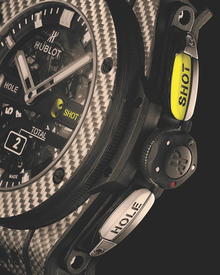 Big Bang Unico高尔夫腕表在设计与功能上有许多高尔夫元素。腕表2点钟位置设有高尔夫推杆形状的按钮,可计算每洞的挥杆数,佩戴者在前往下一洞准备时,可按动4点钟位置的按钮使杆数计数器归零。6点钟位置处的计数器显示总杆数并实时更新。8点钟位置处的按钮形似发球座,用于完成全部球洞后重启全部计数装置,该按钮旋转45°即可锁定,可避免在比赛进程中佩戴者误触启动。