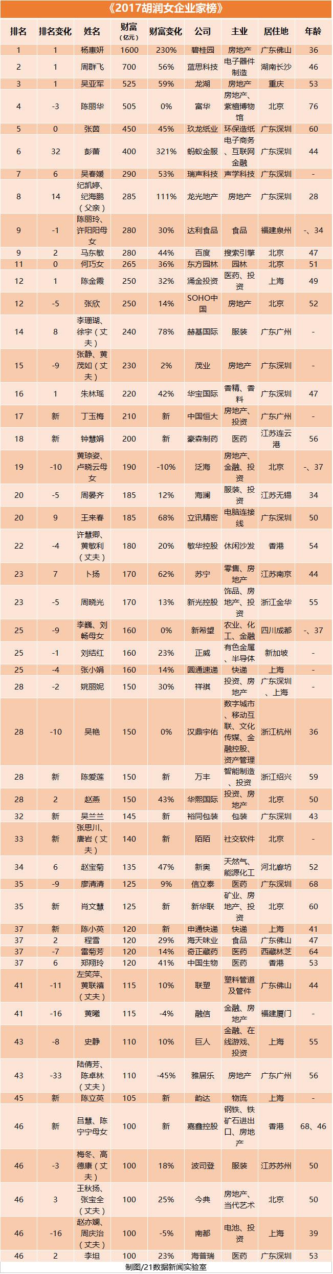 据21数据新闻实验室获悉,10月26日,胡润研究院发布《2017胡润女企业家榜》(Hurun Richest Women in China 2017),这是胡润研究院连续第十二次发布“胡润女企业家榜”前50名。与胡润百富榜总榜不同,女企业家榜单独计算了那些能够从家族财富中剥离出的女企业家的个人财富。财富计算的截止日期为2017年8月15日。