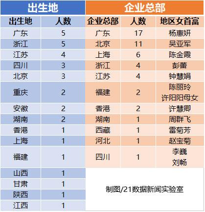 白手起家女富豪平均年龄52岁,其中有10位“70后”,以蓝思科技的周群飞为首,“80后”只有1位:汉鼎宇佑的吴艳。白手起家女企业家中,总部在广东的最多,有11位;其次是北京有10位,江苏和上海各有3位。从出生地来看,粤商也最多,有4位。