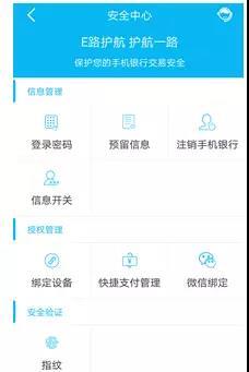 (1)打开手机银行的“个人中心”,点击“安全中心”,如下图所示: