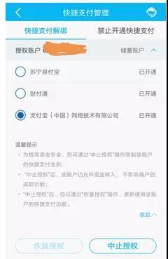 (3)在“快捷支付管理”中,选择该银行卡需要解除绑定的快捷支付渠道,点击右下方的“中止授权”即可以关闭快捷支付功能。