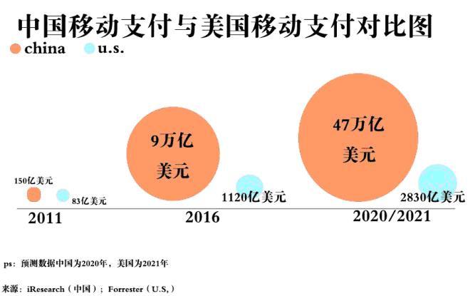 根据预测数据显示,2020年~2021年,中美移动支付差距将进一步扩大,中国移动支付市场交易规模将达到美国的168倍。