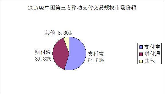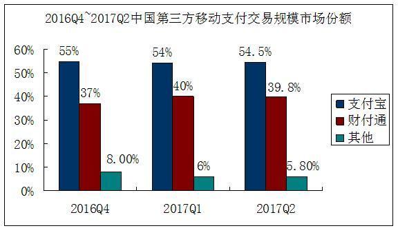 据艾瑞报告数据显示,2017年第二季度,支付宝市场份额占比从一季度的54%扩大到二季度的54.5%;微信支付背后的财付通则从上季度的40%环比回落至39.8%。