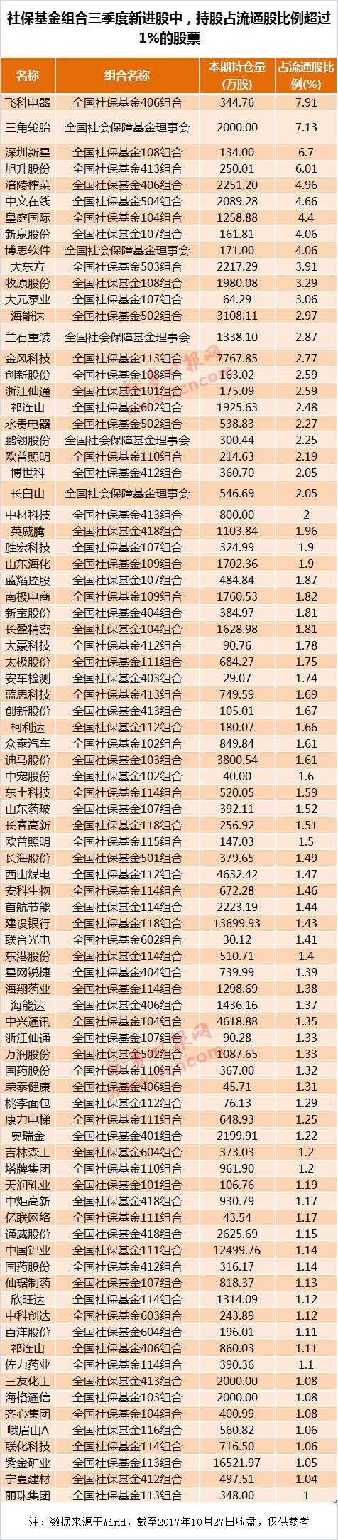 截至10月27日收盘,披露三季报公司数量已过半,接近2000家。 具体来看,35个社保基金投资组合新进119家公司的前十大股东或流通股东名单。在新进股中,社保基金一一三组合对紫金矿业,一一八组合对建设银行、一一一组合对中国铝业等股票的最新持股数量均超过1亿股。社保基金对飞科电器、三角轮胎、深圳新星、旭升股份的持股比例相对较大,所持股份数量超过相应公司流通股本的5%。